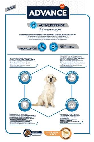 Advance Maxi Adult hondenbrokken zijn speciaal ontworpen voor volwassen honden van grote rassen. Deze complete en licht verteerbare voeding bevat brokken die perfect zijn afgestemd op de kaakgrootte van grote honden, wat helpt bij het ondersteunen van een gezond gebit en het voorkomen van tandplak. Rijk aan kip en rijst, stimuleert deze voeding een gezonde darmwerking. De toevoeging van omega-3 en -6-vetzuren draagt bij aan een glanzende vacht en een gezonde huid, terwijl taurine zorgt voor een goede hartfunctie. Met een uitgebalanceerd eiwitgehalte ondersteunt Advance Maxi Adult het behoud van sterke spieren.