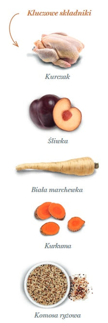Świeżo przygotowany kurczak 70% (używamy 140 kg świeżo przygotowanego kurczaka do wytworzenia 100 kg naszego produktu), brązowy ryż, cały zielony groszek, hydrolizat wątroby kurczaka, drożdże (Saccharomyces cerevisiae), białko ziemniaczane, błonnik jabłkowy, minerały, olej rybny (chroniony naturalnymi tokoferolami), glukozamina 1400 mg/kg, odwodniona dynia, komosa ryżowa 1000 mg/kg, odwodnione brokuły, odwodniony jarmuż, kryl antarktyczny, wodorosty kelp, żurawina, spirulina, biała marchew 1000 mg/kg, odwodnione śliwki 1000 mg/kg, cykoria (źródło FOS) 1000 mg/kg, hydrolizowana ściana komórkowa drożdży (źródło MOS) 1000 mg/kg, chondroityna 1000 mg/kg, kurkuma 1000 mg/kg, imbir, rozmaryn, yucca schidigera.