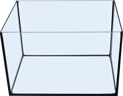 Glazen aquarium zonder bovenkap. De naden van het aquarium zijn met duurzame zwarte kit gedicht, en houden de panelen op zijn plaats.