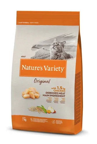 Nature's Variety Original Chicken is een volledig en uitgebalanceerd droogvoer voor volwassen katten, verkrijgbaar in verpakkingen van 1,25 kg en 7 kg. Dit premium kattenvoer is samengesteld met ontbeende kip (21%) als hoofdingrediënt, aangevuld met groenten, fruit en superfoods. Dankzij de bereiding op lage temperatuur blijven de voedingsstoffen optimaal behouden, waardoor jouw kat elke dag een gezonde en smakelijke maaltijd krijgt.