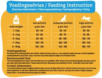 Introduceer deze voeding geleidelijk over een periode van 7 dagen om spijsverteringsproblemen te voorkomen. Zorg dat jouw hond altijd toegang heeft tot vers drinkwater. Bewaar het voer op een koele, droge plaats.