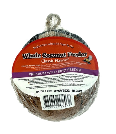 De Suet To Go Hele Kokosnoot is lekker wintervoer voor tuinvogels, rijk aan vet voor extra energie in een natuurlijke kokosnoot. Vogels in de tuin of op het balkon kunnen in de winter wel wat extra's gebruiken en ze zullen graag naar jouw tuin of balkon komen voor deze leuke gevulde kokosnoot. De kokosnoot is natuurlijk en gevuld met vet, om de vogeltjes broodnodige extra energie te geven. Aan het touw hang je de kokosnoot eenvoudig op.