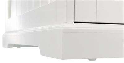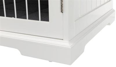 De bench is gemaakt van stevig witgelakt MDF met een deur voorzien van metalen tralies en een schuifsluiting. Dit biedt je hond een fijn gevoel van veiligheid en tegelijkertijd overzicht op de ruimte. Voor extra comfort wordt de bench geleverd met een mat in een luxe schapenvachtlook. De mat heeft een schuimrubber vulling en een slipvaste onderkant, zodat deze altijd op zijn plek blijft.