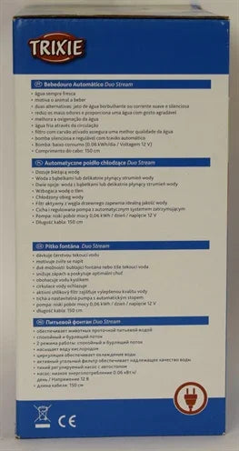 Trixie Duo Stream drikkefontænen giver en konstant forsyning af frisk, iltrigt vand til din hund eller kat. Takket være de to indstillinger kan du vælge mellem en boblende stråle eller en blid spray, afhængigt af dit kæledyrs præference. Vandcirkulationen bidrager til naturlig afkøling og opfordrer kæledyr til at drikke mere. Det aktive kulfilter forbedrer vandkvaliteten ved at reducere smagsstoffer og urenheder. Pumpen har en autostopfunktion for ekstra bekvemmelighed. Drikkefontænen er lavet af plastik og er energieffektiv. Udskiftningsfiltre kan købes separat.