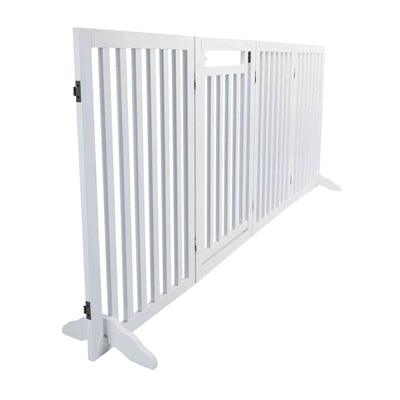 Het Trixie Hondenhek Met Deur Wit 60-160 x 81 cm is een vierdelig hek uit gelakt MDF, op verschillende manieren op te stellen, met voetjes.