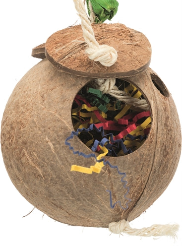Superleuk vogelspeeltje wat gemaakt is van kokosnoot, maïslies, wilgenteen en sisal. Het speeltje is gevuld met papiersnippers en kan dankzij de twee openingen makkelijk gevuld worden met bijvoorbeeld snacks.