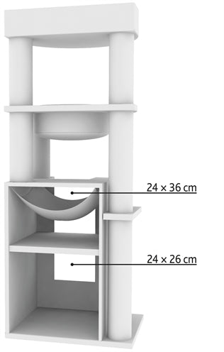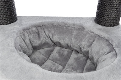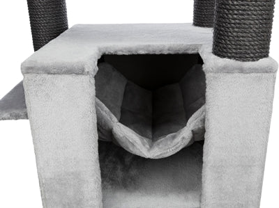 De Trixie Krabpaal XXL Leandro Grijs 63 x 50 x 163 cm is een extra groot krabmeubel voor grote kattenrassen, met schuilplaatsen, relax-slaapzak, hangmat en ligplateau. Wil jij jouw katten de ultieme luxe bieden? Kies dan voor dit uitgebreide krabmeubel van Trixie! Krabpaal XXL Leandro is een zeer uitgebreid krabmeubel dat ook geschikt is voor grotere kattenrassen. Het zeer complete krabmeubel bestaat uit onder andere meerdere krabstammen bekleed met sisal, een schuilplaats binnenin bekleed met pluche en een ligplateau met een mand met gevoerde rand. Ook kan jouw kat heerlijk luieren in de stevige, gevoerde relax-slaapzak en de afneembare hangmat in de schuilplaats. Voor extra krabplezier is de zijkant van de toren ook nog voorzien van een groot sisal-krabvlak. Uitgerust met een dikke, massieve bodemplaat voor meer stevigheid, die zorgt dat de krabpaal stevig blijft staan ook als grote katten als Maine Coons en boskatten op de krabpaal springen.