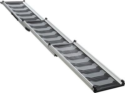 De Trixie Loopplank Telescopisch Tot 90 kg Zwart / Grijs van 40X78X175 cm is een uitschuifbare loopplank met slipvast loopvlak om de hond te helpen in en uit de auto te komen. Deze loopplank is bijzonder geschikt om mee op reis te nemen, omdat hij zeer compact op te bergen is en zo overal mee naartoe kan. De loopplank kan ook veilig gebruikt worden bij nattigheid, omdat hij een slipvast loopvlak heeft. Eveneens is deze loopplank voorzien van een rubberen laag, die de bumper van de auto beschermt tegen schade. De plank is traploos verstelbaar in lengte en geschikt voor honden tot 90 kg.