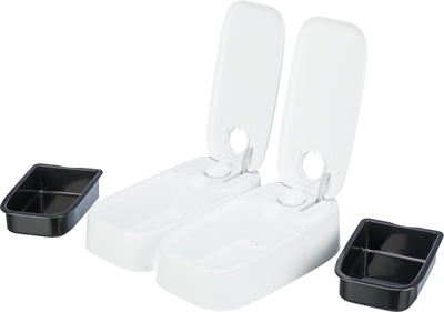 De Trixie Tx2 Automatische Voerdispenser in wit/zwart van 2x300 ml is een voerbak die zorgt voor voer en water tijdens je afwezigheid.