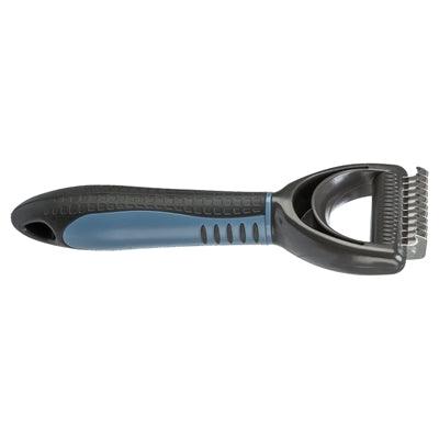 De kam is voorzien van een vertanding met een lengte van 1 cm, ideaal voor het gladmaken van zowel het dekhaar als de vervilte onderwol. De combinatie van het kunststof handvat met een rubberen coating en het metalen kamgedeelte zorgt voor een stevige grip en een lange levensduur.